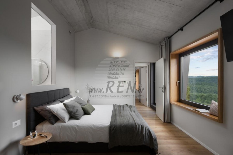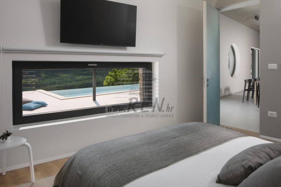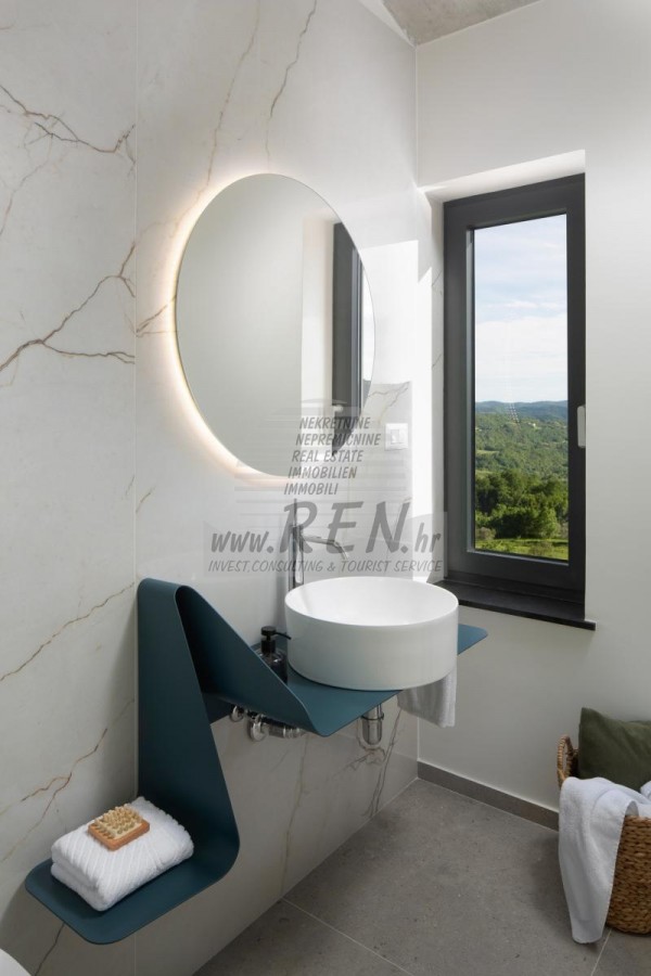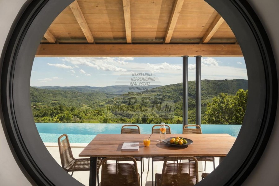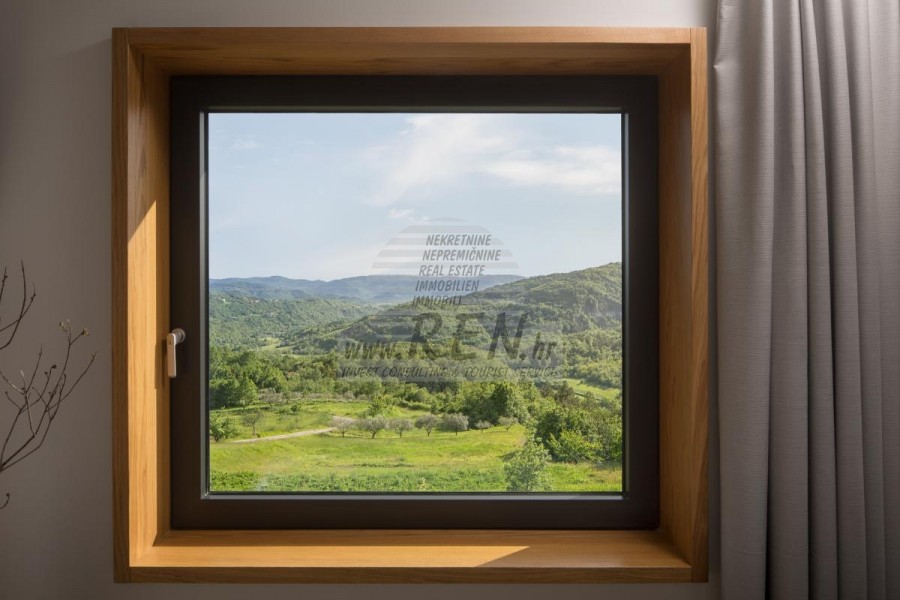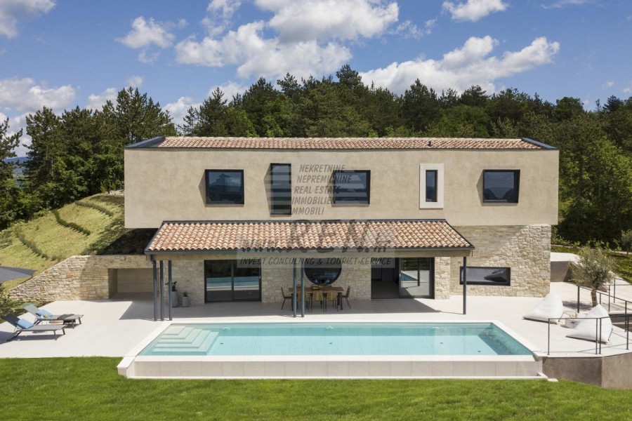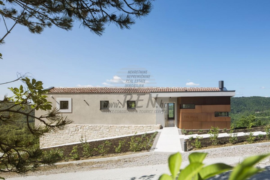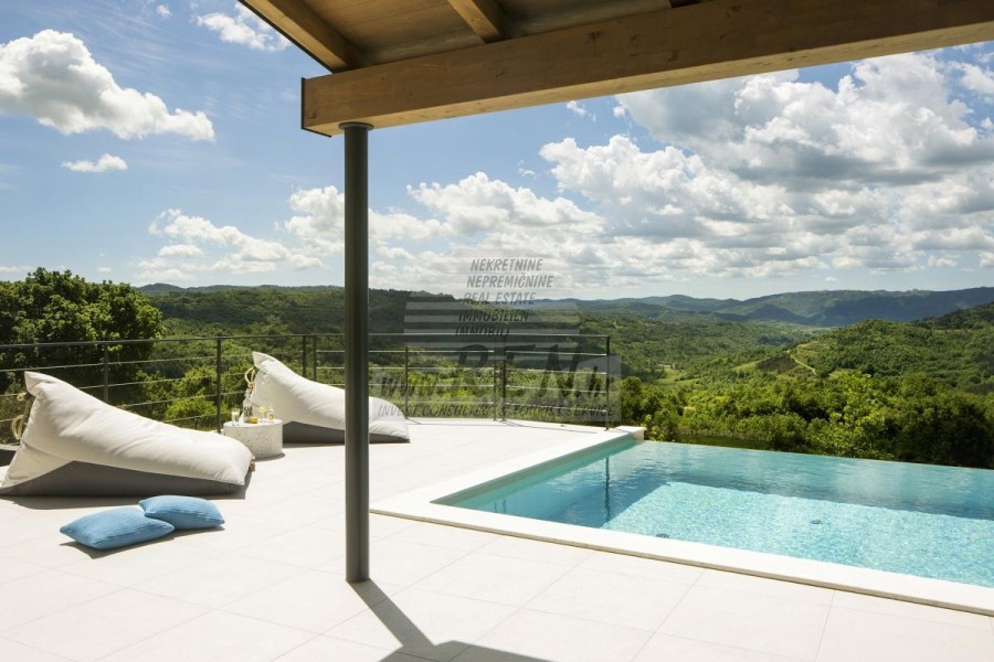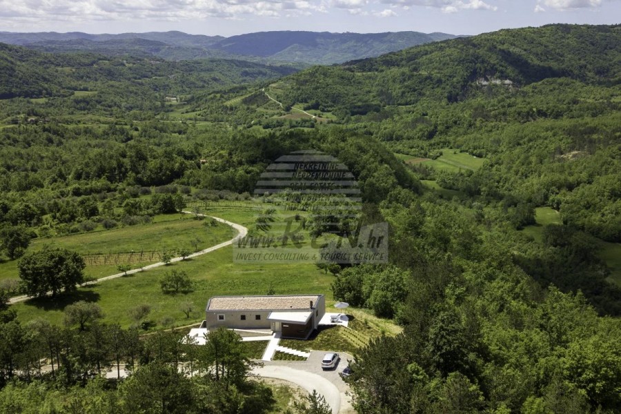 Die Luxusvilla mit einer der schönsten Aussichten in Istrien befindet sich in einem kleinen Dorf in der Nähe von Buzet und bietet einen herrlichen Blick auf die Natur, Weinberge und Olivenbäume. Vom 52 m² großen Swimmingpool aus können Sie die Aussicht auf die Täler und Hügel Zentralistriens genießen. Das gesamte 1800 m2 große Grundstück liegt abseits von anderen Häusern. Das Anwesen ist von einem Olivenhain umgeben, der sich über zwei Kaskaden erstreckt. Dies ist ein neu erbautes Anwesen, das nach soliden Umweltprinzipien gebaut wurde und nur natürliche Materialien wie Stein und Holz verwendet. Der Garten ist mit heimischen Duftpflanzen geschmückt. Die Hauptvilla verfügt über 4 Schlafzimmer mit en-suite Badezimmern, die alle eine schöne Aussicht bieten. Das Wohnzimmer verfügt über eine luxuriöse Küche, es gibt auch ein Esszimmer mit Kamin und ein Wohnzimmer mit herrlichem Blick auf die Natur. Das Haus hat auch eine Taverne von 21 m2. Die Villa ist mit einem hochmodernen Zentralheizungs- und Kühlsystem sowie einer Vorbereitung für Sonnenkollektoren ausgestattet, und alle Badezimmer und das Wohnzimmer mit Küche haben auch eine Fußbodenheizung. Neben Sonnenbaden, bezaubernder Aussicht und Ruhe bietet das Schwimmbad auch eine Vorbereitung für die Poolheizung. Es gibt auch einen Parkplatz für zwei Autos, sowie alle zusätzlichen Einrichtungen wie Grill im Freien usw.