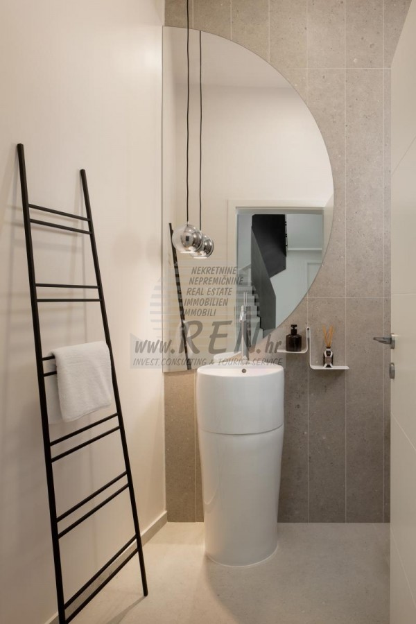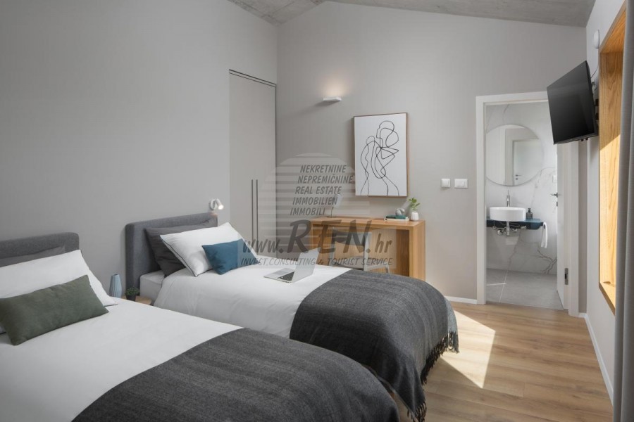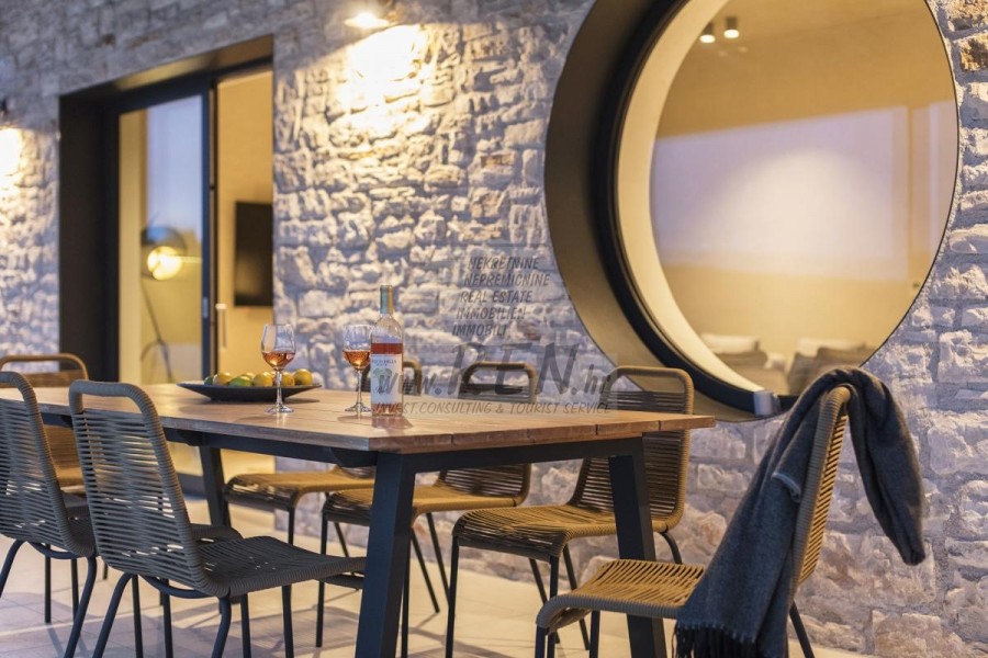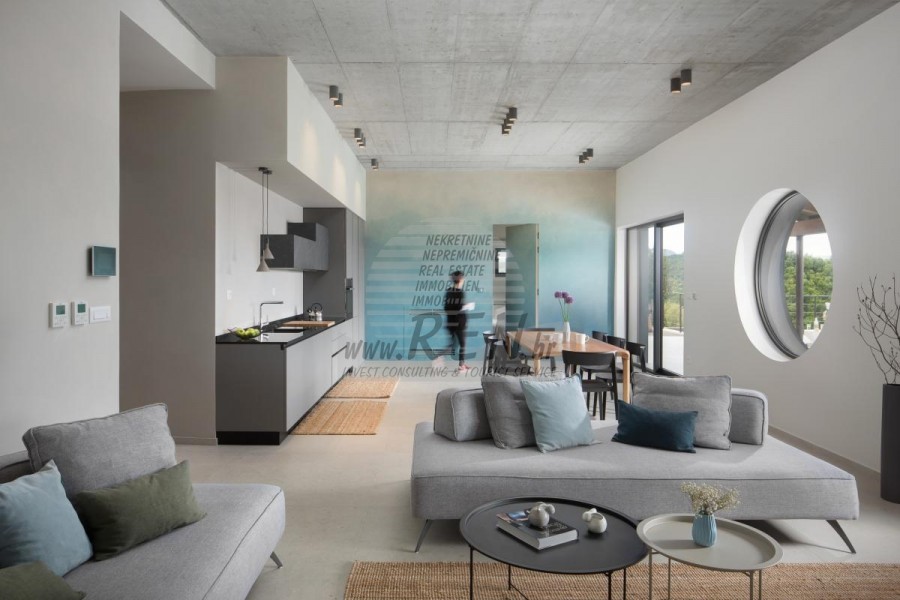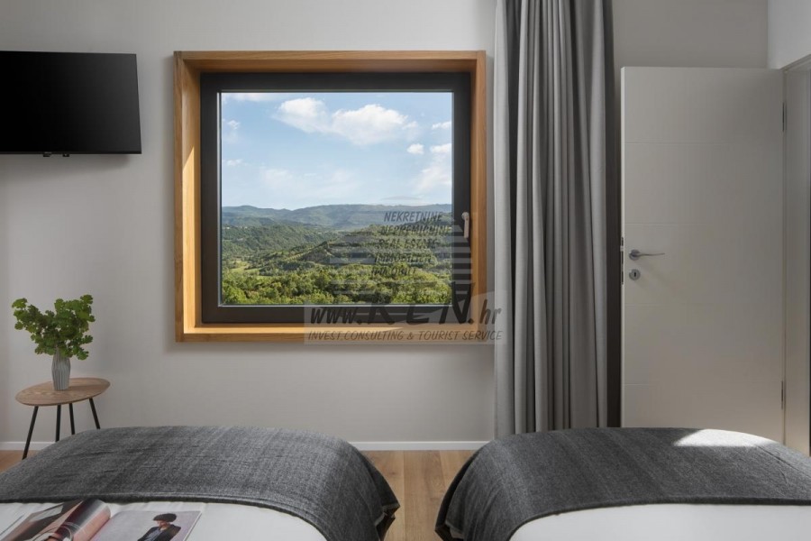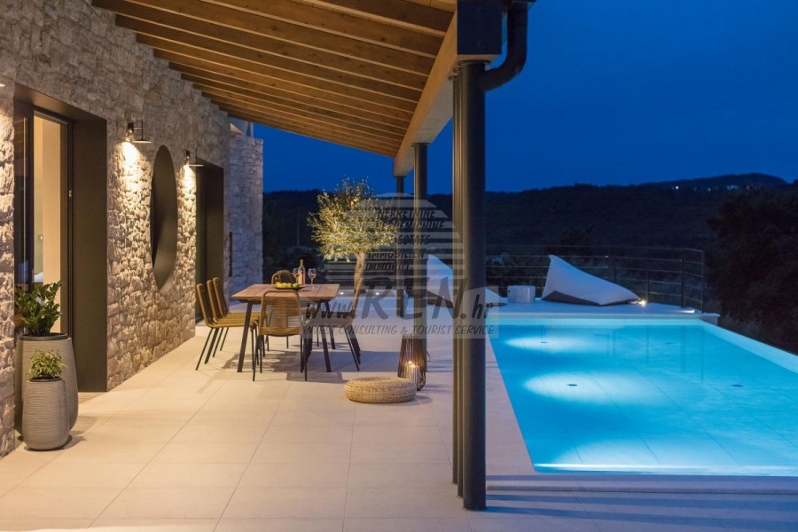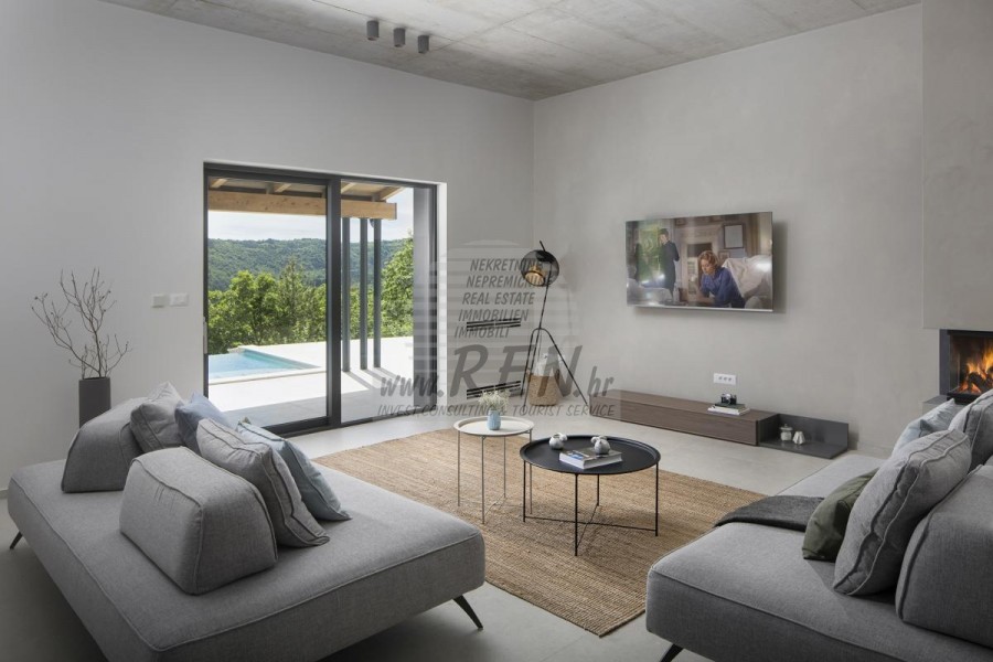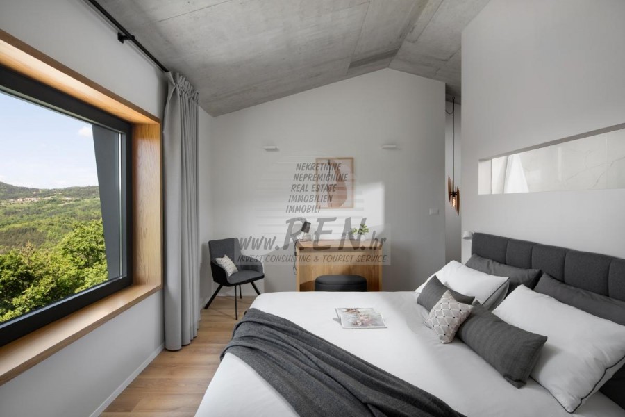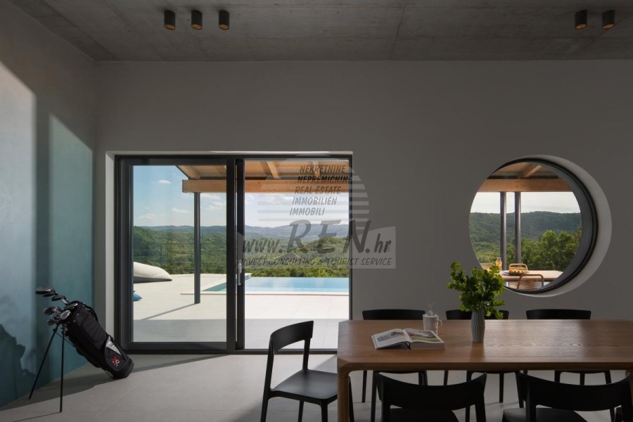 Die Luxusvilla mit einer der schönsten Aussichten in Istrien befindet sich in einem kleinen Dorf in der Nähe von Buzet und bietet einen herrlichen Blick auf die Natur, Weinberge und Olivenbäume. Vom 52 m² großen Swimmingpool aus können Sie die Aussicht auf die Täler und Hügel Zentralistriens genießen. Das gesamte 1800 m2 große Grundstück liegt abseits von anderen Häusern. Das Anwesen ist von einem Olivenhain umgeben, der sich über zwei Kaskaden erstreckt. Dies ist ein neu erbautes Anwesen, das nach soliden Umweltprinzipien gebaut wurde und nur natürliche Materialien wie Stein und Holz verwendet. Der Garten ist mit heimischen Duftpflanzen geschmückt. Die Hauptvilla verfügt über 4 Schlafzimmer mit en-suite Badezimmern, die alle eine schöne Aussicht bieten. Das Wohnzimmer verfügt über eine luxuriöse Küche, es gibt auch ein Esszimmer mit Kamin und ein Wohnzimmer mit herrlichem Blick auf die Natur. Das Haus hat auch eine Taverne von 21 m2. Die Villa ist mit einem hochmodernen Zentralheizungs- und Kühlsystem sowie einer Vorbereitung für Sonnenkollektoren ausgestattet, und alle Badezimmer und das Wohnzimmer mit Küche haben auch eine Fußbodenheizung. Neben Sonnenbaden, bezaubernder Aussicht und Ruhe bietet das Schwimmbad auch eine Vorbereitung für die Poolheizung. Es gibt auch einen Parkplatz für zwei Autos, sowie alle zusätzlichen Einrichtungen wie Grill im Freien usw.