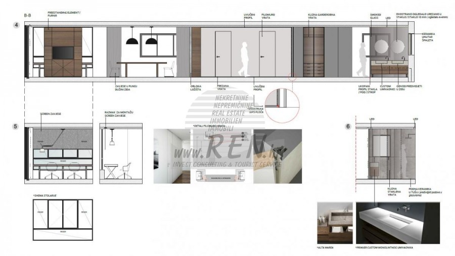 Das Apartment ist luxuriös mit maßgefertigten Möbeln eingerichtet, die sowohl Funktionalität als auch Ästhetik gewährleisten. Der Raum ist durchdacht gestaltet, um das natürliche Licht und den Meerblick zu maximieren. Der Hauptwohnbereich umfasst: