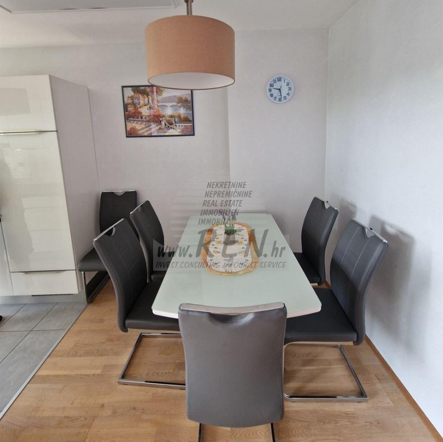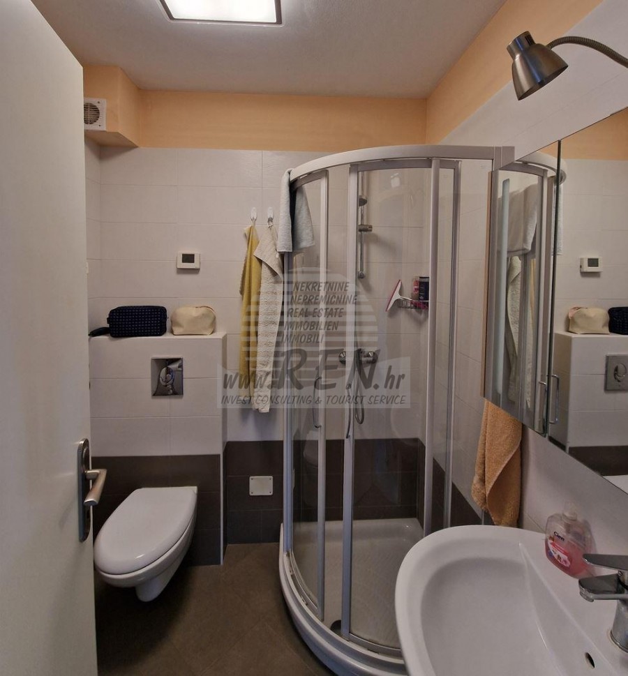 Die Wohnung in der Nähe von Umag hat eine Gesamtfläche von 52,80 m2, liegt im zweiten Stock, wurde 2013 erbaut und ist 5 Min. (200 m) vom Meer und vom angelegten Strand, 10 Min. (4000 m) vom Zentrum von Umag entfernt. Die Wohnung besteht aus einer Küche mit Esszimmer, Wohnzimmer, Badezimmer, Schlafzimmer, Flur, Terrasse. Es ist mit Klimaanlage, Aufzug, Privatparkplatz und Meerblick ausgestattet. Es wird mit Möbeln verkauft.