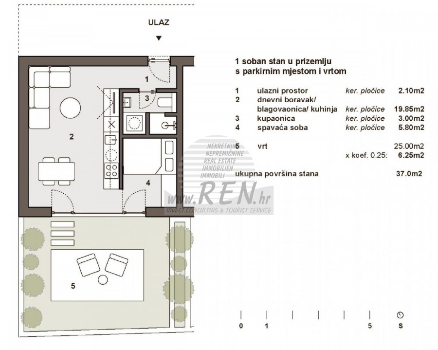Wohnung mit einer Gesamtfläche von 37 m2, Garten 25 m2, nur 5 min. (2000m) vom Meer und von schönen Natursteinstränden, 10 min. (5000 m) vom Zentrum von Umag entfernt. Befindet sich im Erdgeschoss. Im Aufbau. Insgesamt gibt es Schlafzimmer, Küche, Wohnzimmer, Badezimmer. Hat eigene Parkplätze.